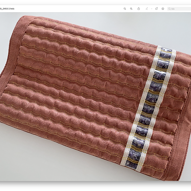En skön ametist-kudde med kanaler fyllda av krossad ametist-sten som med fördel kan användas tillsammans med ametistmattans värmeterapi eller när helst man önskar goda stödegenskaper för nacke och rygg.
